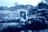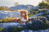 A Nova Scotia Duck Tolling Retriever reclines on rocky terrain covered with blue wildflowers under warm sunlight. The photo captures the dog's relaxed posture and the tranquil floral scene.