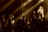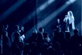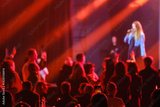 Crowd watching a singer perform on stage with vivid light effects and dynamic ambiance.