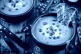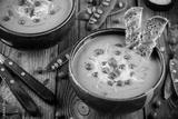 Green pea soup on wooden rustic background