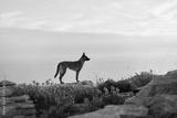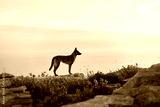 A Belgian Malinois stands poised in a colorful wildflower field under the warm glow of sunset. The harmonious atmosphere emphasizes the dog's connection to the rugged environment.