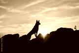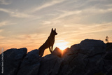 A Belgian Malinois stands on a rocky outcrop illuminated by the golden hues of morning light. The scene showcases the dog's elegance amidst a serene natural backdrop.