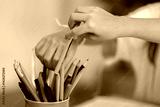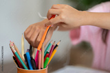 Art Supplies and Creativity. A child organizing colorful pens and pencils in a classroom.