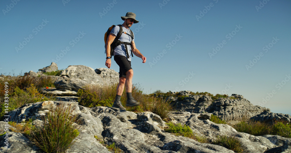 Hiking, mountain and walking with man in nature for fitness, travel adventure and workout. Space, backpacking and exercise with person outdoor on cliff for trekking holiday, explore and peace