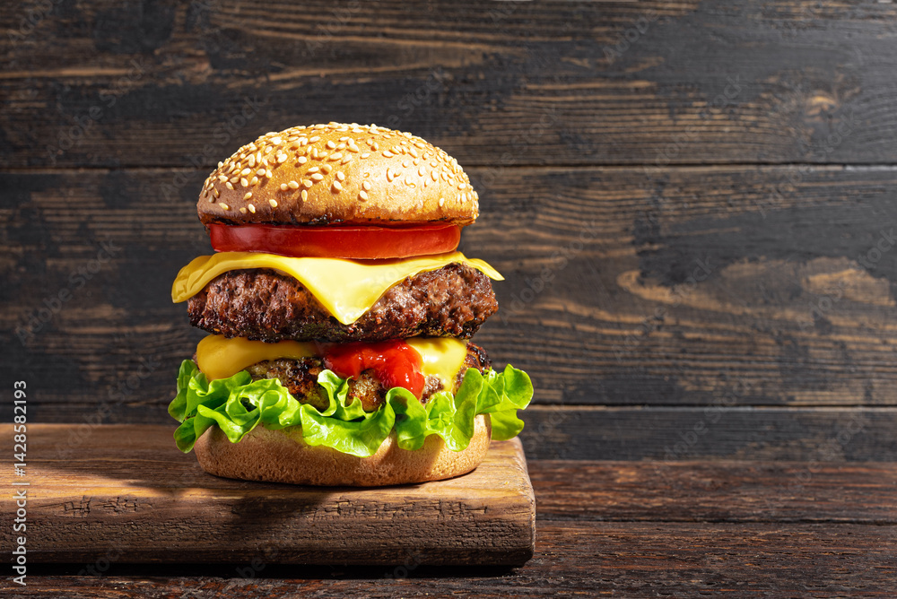 Double beef burger, cheeseburger with vegetables and melted cheese