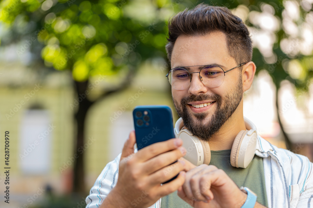 Happy successful satisfied Caucasian man young guy male traveler mobile phone user holding smartphone texting chatting social media tourist online GPS map outdoor urban city street. Town lifestyles.