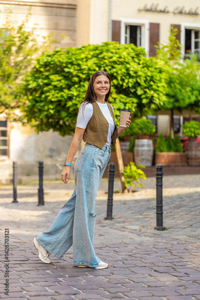 Happy Caucasian young pretty woman enjoying morning coffee hot drink and smiling outdoors. Relaxing, taking a break. Girl walking through urban city street, drinking coffee to go. Town lifestyles.
