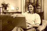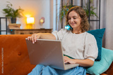 Young woman freelancer at home living room sitting on sofa couch, opens laptop. Portrait of girl works on notebook, sends messages, makes online purchases, watching movies, study. Lifestyles