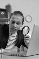 Surprised researcher investigator businessman working at home office holding magnifying glass looking at laptop screen, analyzing text on computer, searching. Amazed Caucasian freelancer in suit.