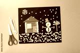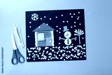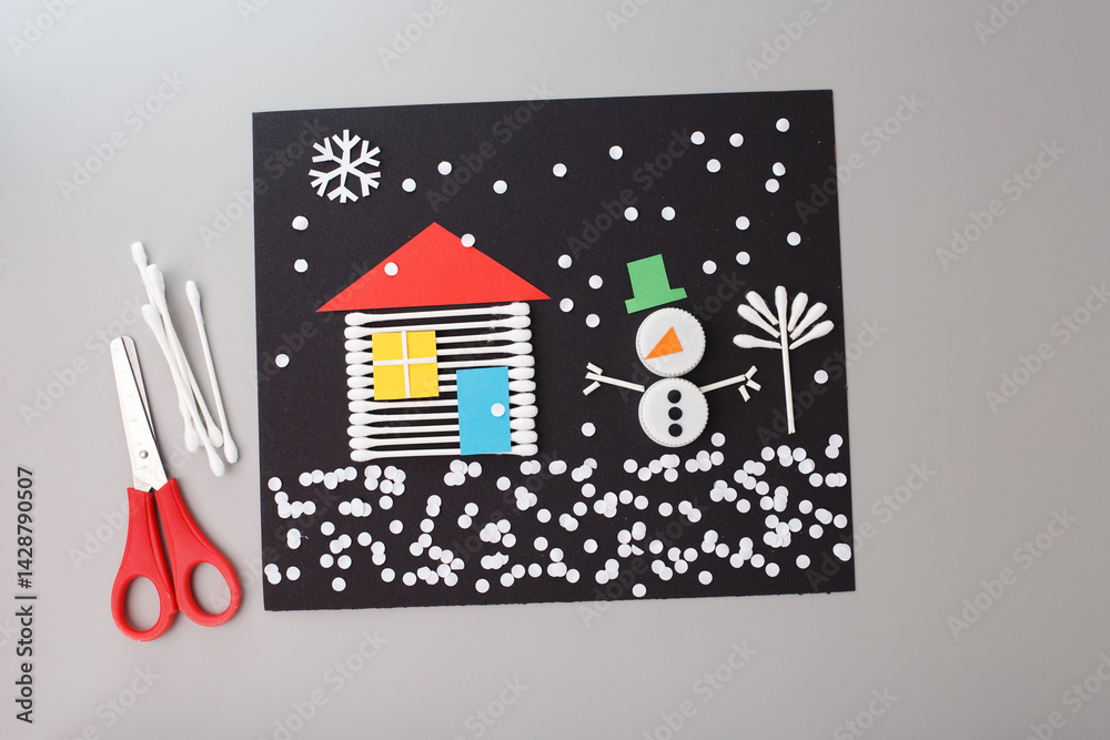 Handmade winter decoration with cotton swab elements, bottle cap snowman, and festive backdrop. Great for eco-friendly product promotions, craft kits, or holiday advertising