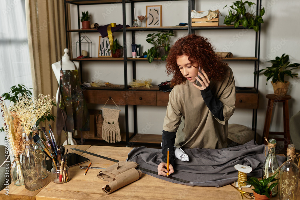 Young woman crafts modern DIY project in stylish creative workspace during afternoon