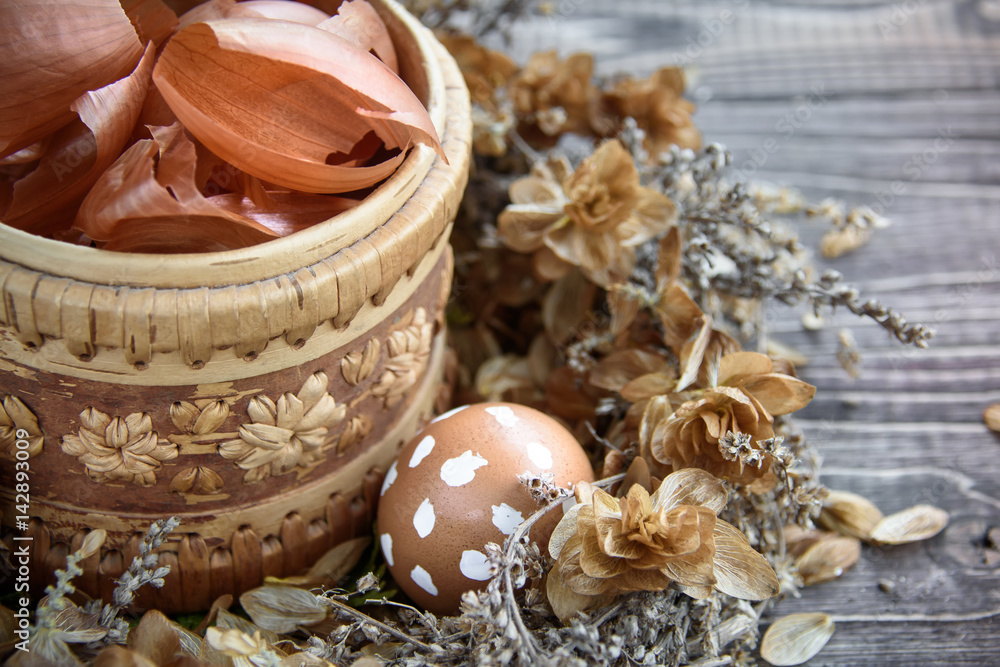 Easter egg in a speck and an onions peel in a basket