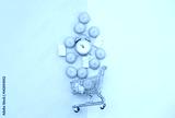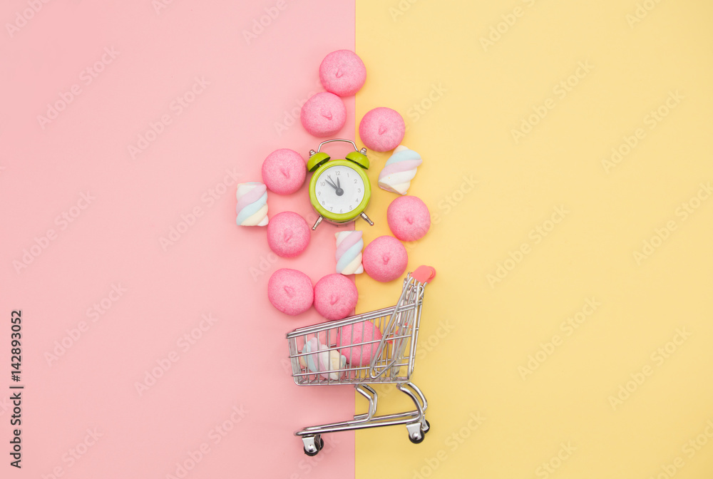 photo of marshmallows and alarm clock near shopping cart on the wonderful background in pop art style