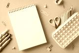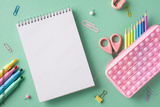 Colorful notepad, pens, pencils, and stationery neatly arranged on a green surface