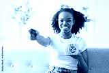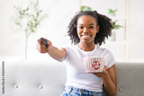 Excited woman American teenager enjoying movie and eating popcorn indoors.