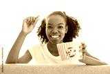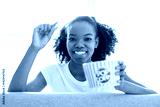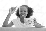 Excited woman American teenager enjoying movie and eating popcorn indoors.