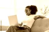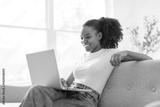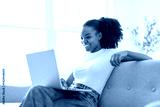 Young woman sitting on floor by the couch using laptop. Afemale working on laptop computer at home.