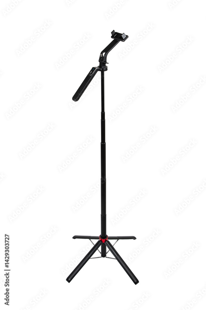 A customizable tripod equipped with a phone mount and a Bluetooth-enabled remote control.