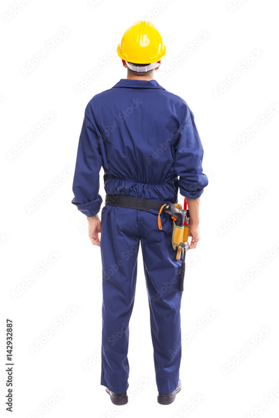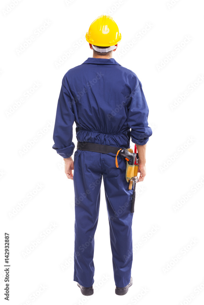 Young worker standing from back on white background