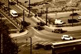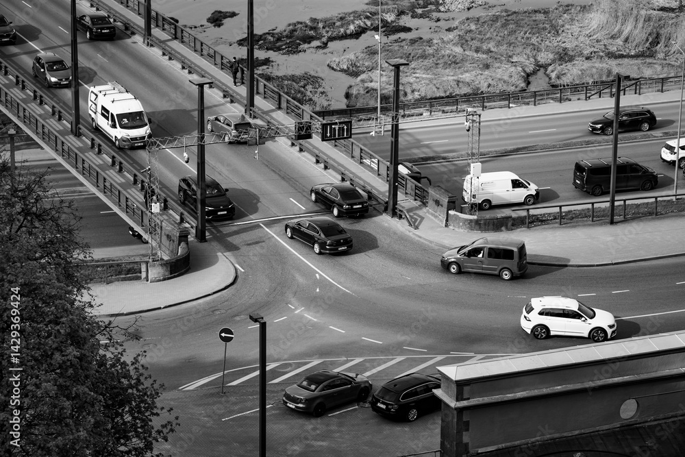Two direction lane intersection of traffic cars in Kaunas, Lithuania. Intensive traffic aerial view of intersection on the bridge