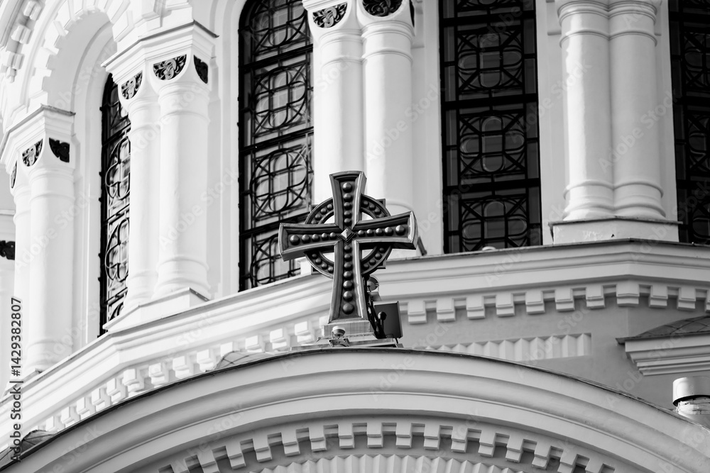 Christianity church cross decoration on facade of big white church, metal christian cross architecture on church building