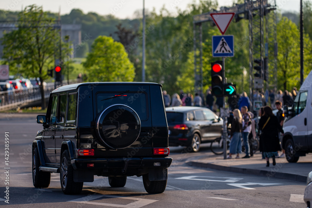 Cars waiting on traffic light at intersection turn in european city of kaunas, traffic lights showing signals for traffic rules and direction for car drivers