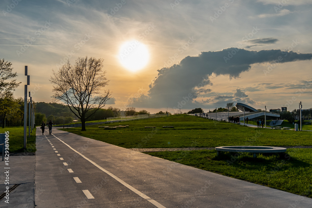 Lush green park pathway directions in different sides for pedestrians and bicycle riders