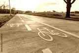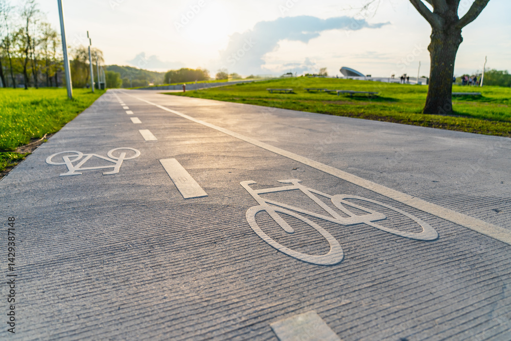 white markings on pathway marking a bicycle lane for bike riders in city lifestyle, road infrastructure for pedestrians and bicycle riders for green thinking of modern transportation system
