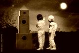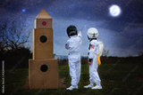 Two adorable children, playing in park on sunset, dressed like astronauts