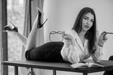 Elegant young woman in business attire lying on office desk with book and glasses