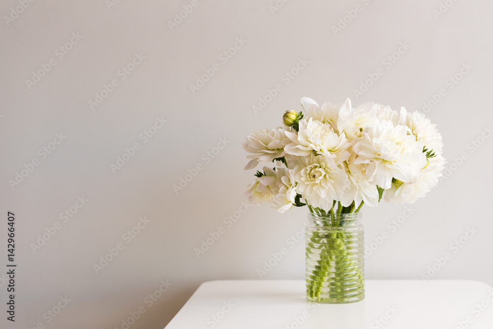 White dahlias in glass jar on white table against neutral background with copy space to left (selective focus)
