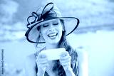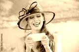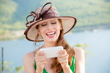 Young Woman in sinamay sun hat Busy with her Mobile Phone While Walking near the park lake. Lady in hat at mobile by the sea.