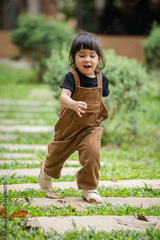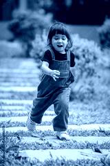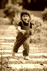 happy toddler girl running on stone pathway in garden