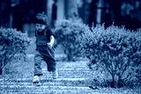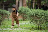 happy toddler girl running on stone pathway in garden
