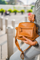 Stylish muslim woman holding a light brown leather bag in hands, outdoor urban fashion shot, focus on accessories, fashion accessories concept