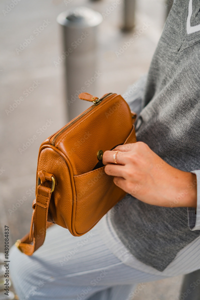 Stylish muslim woman holding a light brown leather bag in hands, outdoor urban fashion shot, focus on accessories, fashion accessories concept
