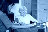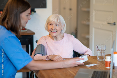 Nurse assisting senior patient with heart exam taking pressure measurement