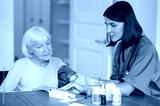 Female doctor providing assistance to senior patient taking test for blood pressure measurement
