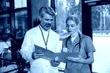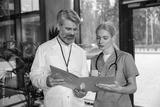 Two doctors discussing medical case and looking involved and focused