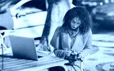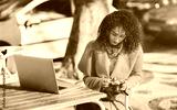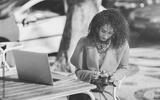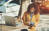 Pensive beautiful woman holding retro film camera while sitting in street cafe with laptop on table, curly charming brunette lady in yellow coat with vintage photo camera and computer in street bar