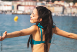 smiling young woman with arms raised relaxed free enjoying on the beach