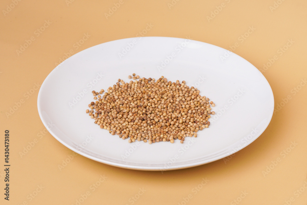 Dried Coriander Seeds on White Plate Natural Culinary Spice for Cooking and Herbal Remedy Closeup Shot with Warm Background