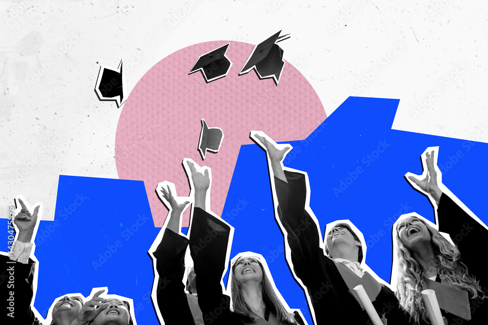 Trend artwork poster composite sketch collage of intelligent graduation silhouette group people hand fly air success young lady man smile