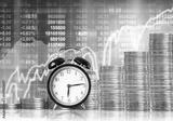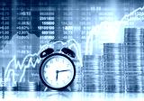 stacks of gold coins step with the vintage clock over the LED display Stock market exchange data background, Business investment and trading concept