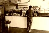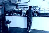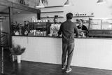 A light-skinned male customer in his 30s wearing a blue shirt and green pants stands ordering at a counter of a coffee shop from two White baristas, a man and a woman in their early 30s wearing aprons