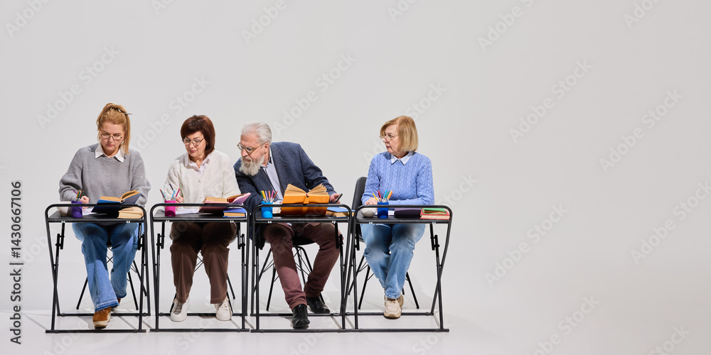 Funny classroom scene, elderly people sitting at desks and doing tasks, man cheating and looking at classmate paper against white background. Concept of education for older adults, active aging