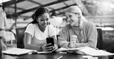 Happy, people and friends with phone in library for social media, research and university feedback. Smile, students and mobile app with education schedule, learning website and studying for knowledge