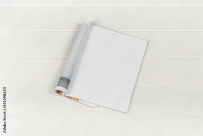 Mock-up magazine or catalog on white wooden table. Blank page or notepad on wood background. Blank page or notepad for mockups or simulations.