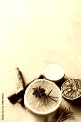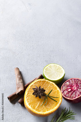 Orange fruit, cinnamon sticks and anise stars isolated on light light background .
