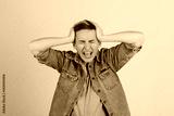 Stressed natural looking woman boy alike with hands on her head isolated on white background. Horizontal image, studio shot