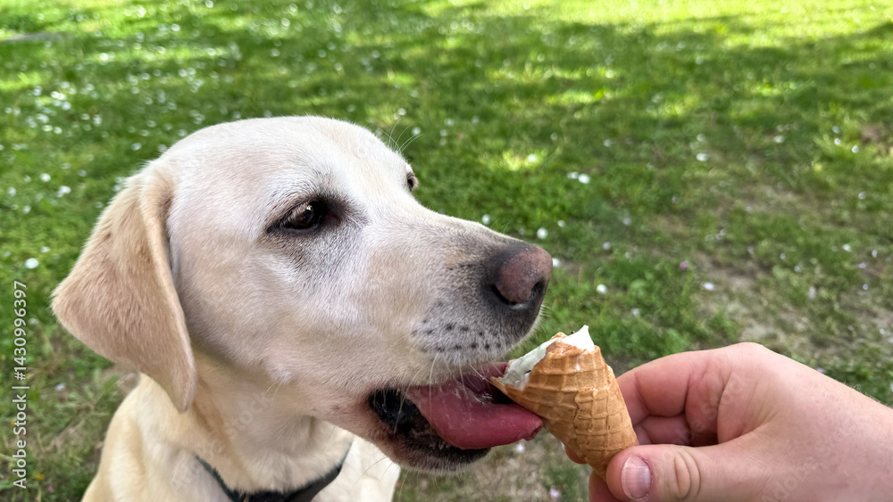 Labrador enjoying ice cream cone outdoors, summer treat and pet fun, leisure in sunny park, International Dog Day